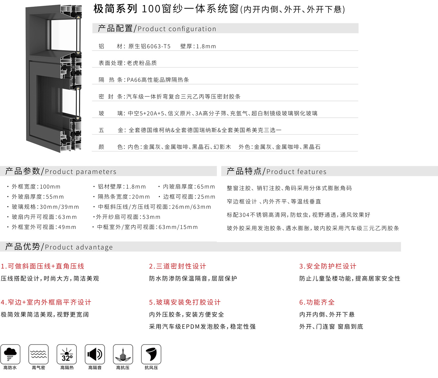 100窗纱一体系统窗(内开内倒、外开、外开下悬)